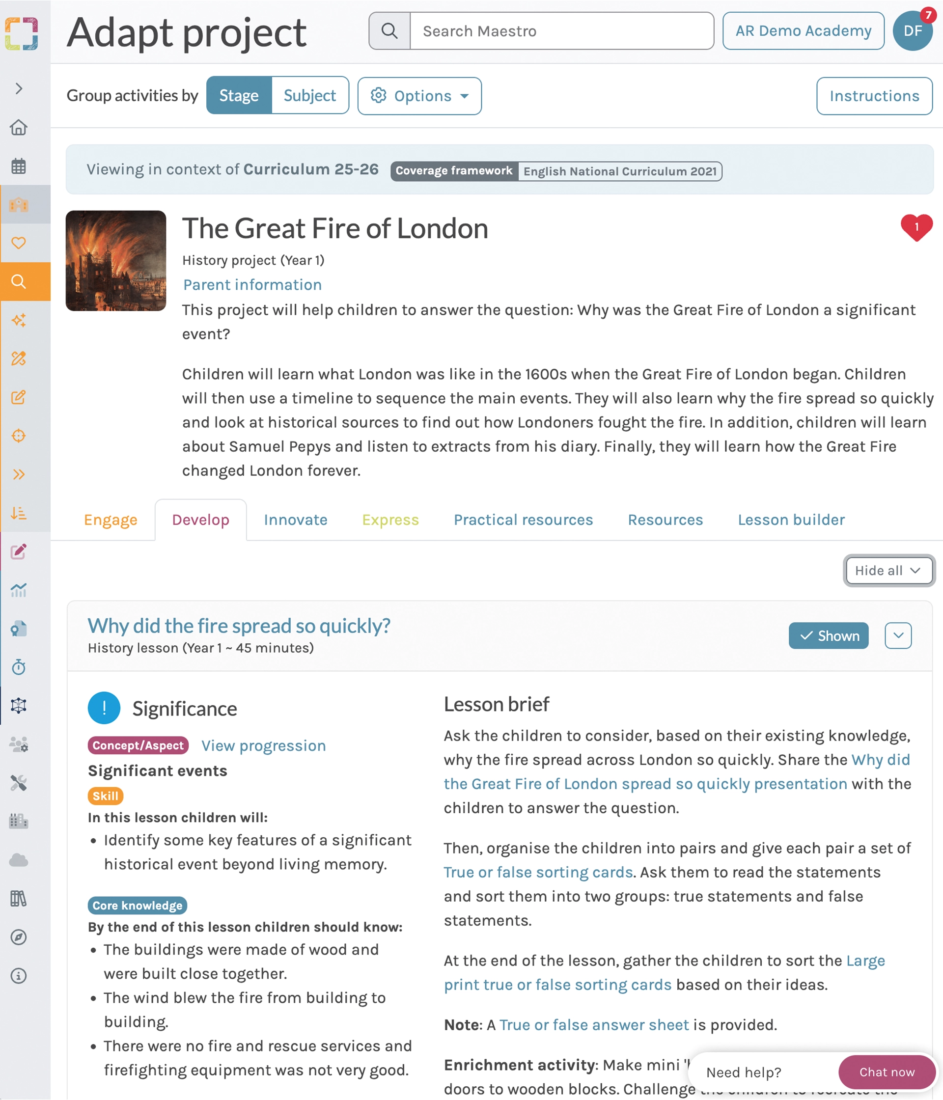 The Great Fire of London provides a structured approach to history, outlining key subjects and topics including:
